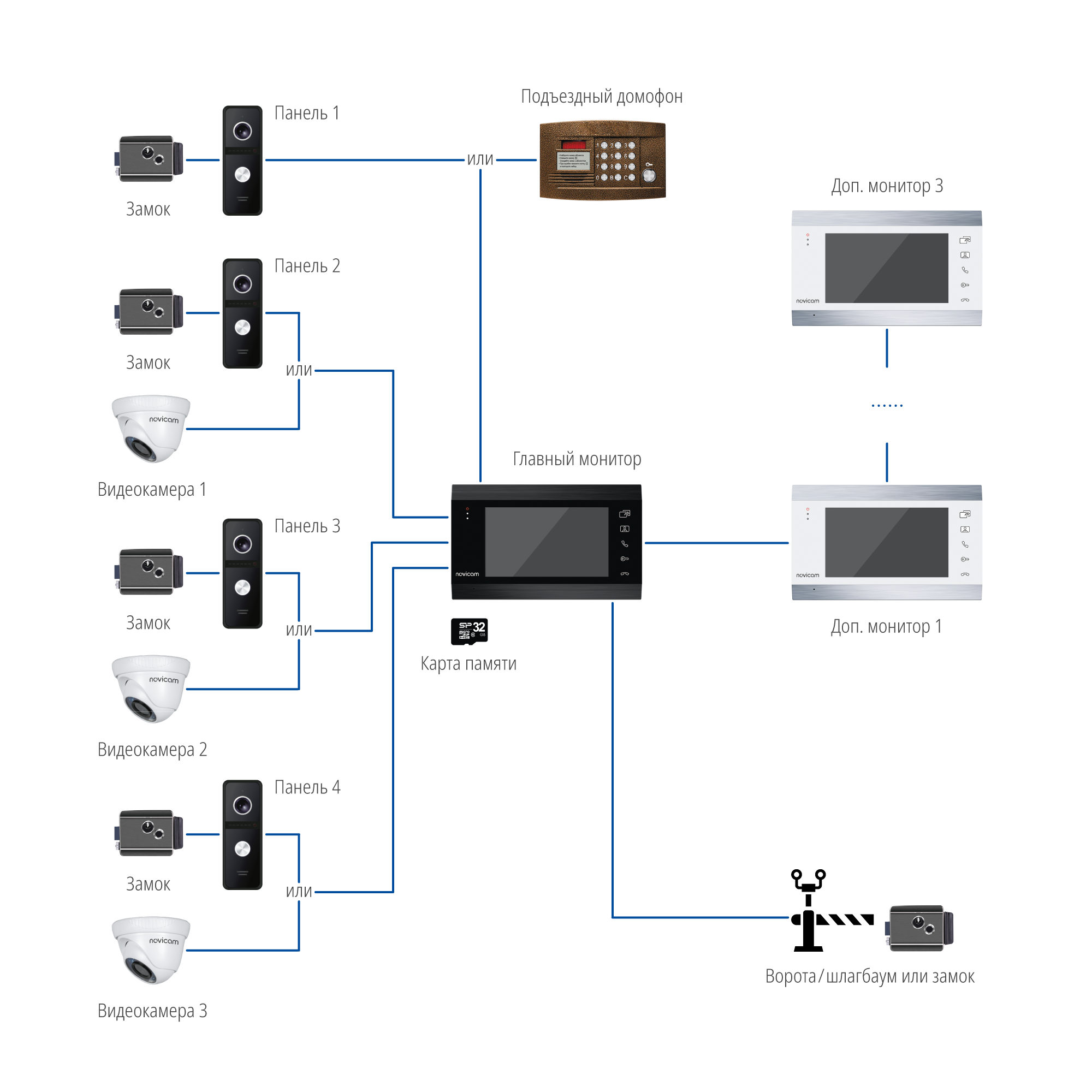 *Видеодомофон поддерживает до 4-х аналоговых вызывных панелей, до 3-х видеокамер, а также до 3-х дополнительных домофонов, которые позволяют продублировать функции главного домофона в других помещениях.