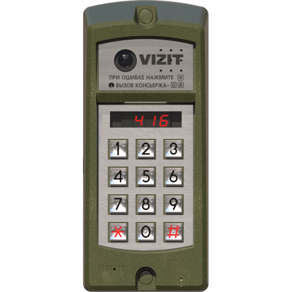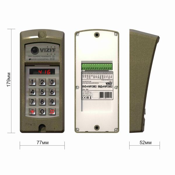 Блок вызова БВД-416FCBE2, используемый в составе многоквартирных домофонов VIZIT, оснащен встроенной IP-камерой с функцией «День-ночь», механическим инфракрасным фильтром и подсветкой светодиодом. Обеспечивает дуплексную громкоговорящую связь с абонентами и возможность открывания входной двери подъезда электронными ключами RFID. Корпус устройства выполнен из ударопрочного поликарбоната, что делает его антивандальным.