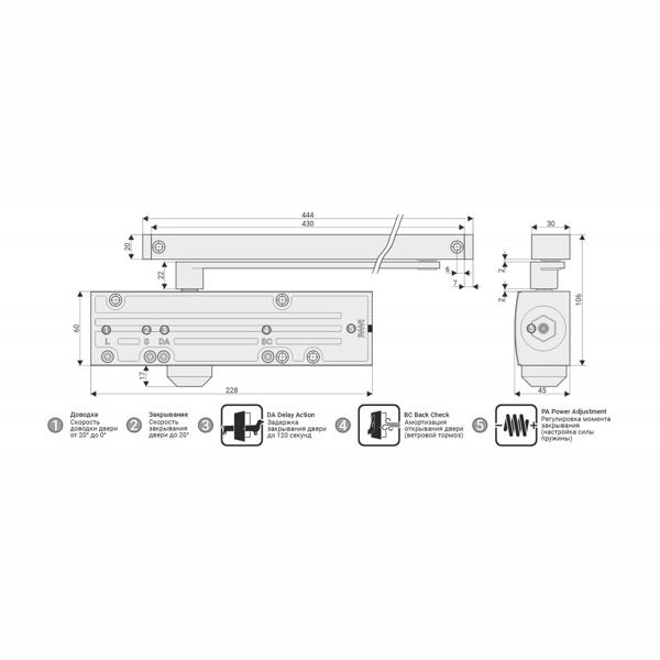 Доводчик DC-025-095 SL+HO+DA+BC PRO белый NOTEDO. Механогидравлический, двухскоростной, штанга со скользящей тягой “SL”. Оснащен функциями регулировки угла открытия, фиксации двери в открытом положении, задержкой закрывания, амортизацией открывания и регулировкой момента закрывания двери. Универсален, подходит для правых и левых дверей. Гарантия – 3 года.