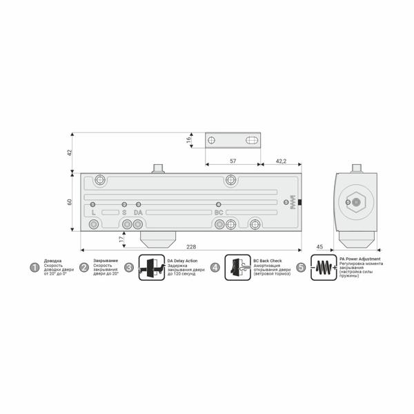 Механогидравлический, оснащен двумя скоростями и функциями задержки закрывания (DA), амортизации открывания (BC) и регулировкой момента закрывания (PA). Универсален, подходит для правых и левых дверей. Гарантия – 3 года.