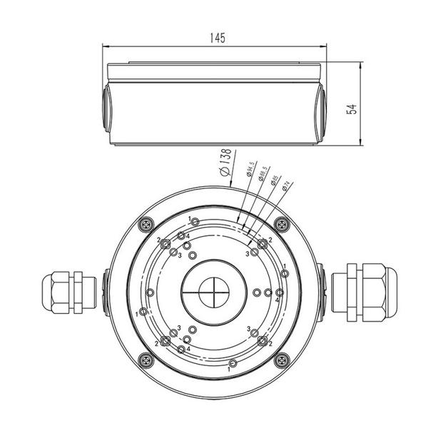 Металлическая коммутационная коробка для защиты кабельных соединений в системах видеонаблюдения. Корпус диаметром 138 мм и высотой 54 мм обеспечивает скрытую установку кабелей, предохраняя их от механических повреждений, воздействия окружающей среды и несанкционированного доступа.