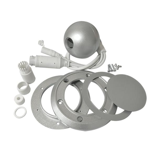 Видеокамера выполнена в серебристом цвете, фланец корпуса скрывает отверстия, сохраняя дизайн крыши или стенки лифта. Питание осуществляется по технологии POE или от блока питания 12 В.