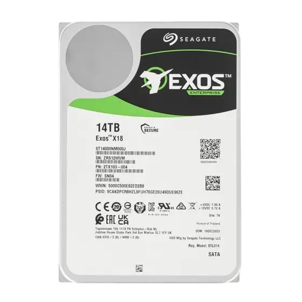 Жесткий диск SEAGATE ST14000NM000J 14 Тб. Форм-фактор 3,5 дюйма, интерфейс SATA III. Скорость вращения шпинделя 7200 об/мин, буфер 256 Мб, скорость передачи данных до 6 Гбит/с.